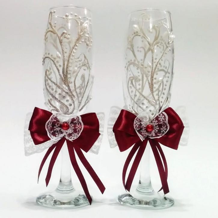 Свадебные бокалы – наверняка вам знакома картина, где у молодоженов за банкетным столом посуда отличается от гостей. Так вот, первое, что стоит сделать молодоженам - это подыскать себе подходящую посуду, сделать ее чуть более уникальной. Прекрасно к этому делу подойдет уникальная роспись в разного рода стилях. Верным будет и решение украсить разнообразными лентами или праздничным кружевом. Если у вас заранее подобрана тематика свадьбы, то можно украсить какими либо элементами, подходящими под нее. Главное - креативность!