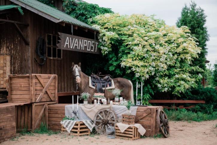Наверное самым лучшим вариантом в оформлении станет выбор именно в пользу свежего воздуха: под кронами деревьев, на лугу, у реки или среди колосьев взошедшей пшеницы. Такой вариант станет самым красивым и насыщенным, главное тут - свежий воздух! Придумать можно уйму всего: мебель преимущественно из дерева, посуда, в остальном тематические предметы и прочее антуражное добро. Таким образом, можно добиться полного погружения в атмосферу деревенской свадьбы.