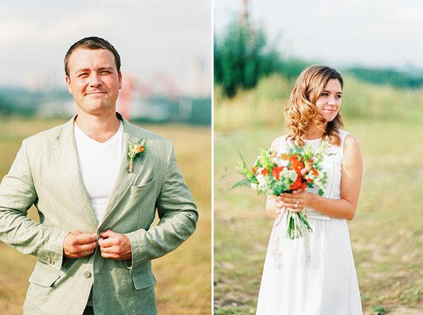 Жениху так же стоит выбирать костюм светлых тонов: от белого до светло-серого или оливкового. Еще стоит учесть, что костюм должен быть из натуральных тканей. В темном и, Боже упаси, из синтетических волокон, новобрачному будет крайне тяжело перенести августовскую знойную погоду. Классический галстук можно заменить бабочкой. А можно обойтись и вообще без оных: небрежно расстегнутый ворот рубашки внесет в образ жениха некую изюминку. А после окончания официальной части пиджак и вовсе может быть снят. Жилетка или подтяжки хорошо впишутся в образ.