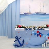 Конечно, не все элементы для декора можно найти у себя дома. Например, такие, как штурвал, спасательные круги, якорь или рыбацкие сети. Но все это можно приобрести в специализированном магазине. Не лишними окажутся и фотографии или картины с изображением морских пейзажей, прикрепленные по стенам. А о ключевых моментах празднования может возвещать корабельная рында.