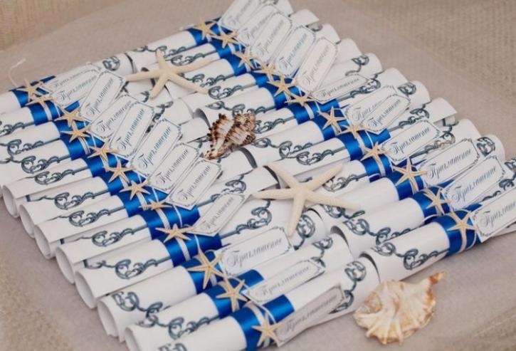 Обязательно стоит обратить свое внимание на печатные атрибуты в организации морской свадьбы. А именно на пригласительные, карточки гостей и, уж тем более, свадебный альбом. Вариантов оформления пригласительных масса: послания в бутылках, свитки с обожженными краями и сургучовой печатью, даже выжженные на небольших досточках, имитирующих кусочки корабельной палубы. Все зависит исключительно от ваших желаний. Сделать это все можно либо самостоятельно, либо обратиться за помощью к специалистам.