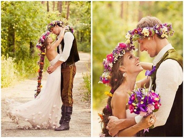 Сейчас мужчины очень полюбили образ некоего брутального средневекового воина, а девушки все больше стремятся быть сильными и независимыми. Такой паре стоит обратить свое внимание на историю храброй рыжеволосой лучницы Мериды из мультфильма «Храбрая сердцем». Для создания антуража отлично подойдут деревянные столы, будто просто сколоченные из грубо отесанных досок, обильное угощение, факелы, волынки. Цвета же лучше выбрать те, которые будут олицетворять густые вековые леса, скалистые горы и суровую красоту шотландской или ирландской культуры.