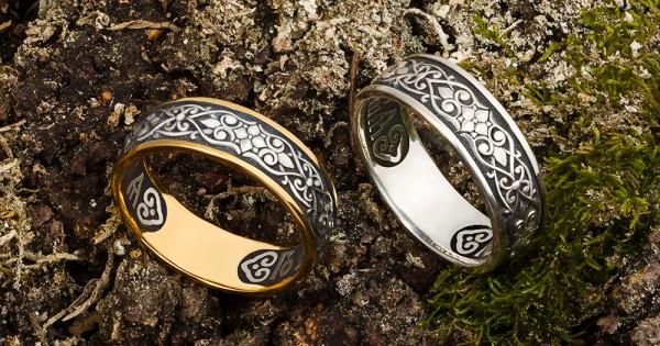 - Венчальные перстни. Это отдельный вид перстня, пришедший к нам из Византии. Он имеет форму креста и покрыт церковными надписями: «Господи, защити своей венчай нас» (по контуру), «От Бога согласие» (сбоку) и «Здоровье», «Благодать» (изнутри). Делается такой перстень из двух металлов. Венчальный перстень невесты изготавливается из серебра с золотой вставкой в центре. Венчальный перстень жениха – наоборот, из золота, с серебряной вставкой.
