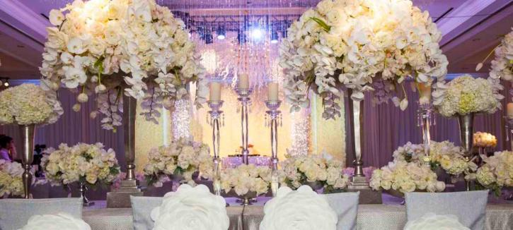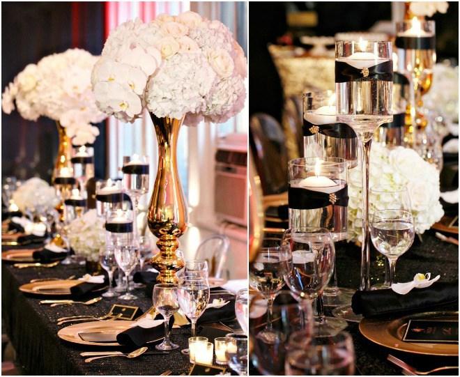 Все должно быть выдержано в стиле строгой роскоши. Изучите правильную сервировку стола, подберите хрустальные бокалы и красивую посуду, обязательно украшайте столы цветочными букетами. В декоре допускается использование жемчуга в небольшом количестве.