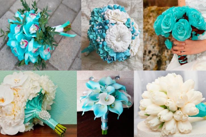 В оформлении этой свадебной темы, флористы делают ставку на розы, орхидеи и пионы. Белый цвет достигается за счёт роз и пионов, орхидея поддерживает тему голубым. Ей помогают в этом дельфиниумы, фиалки, гортензии. Яркие бирюзовые акценты обеспечивают искусственные декоративные элементы - бусины, ленты, бабочки.