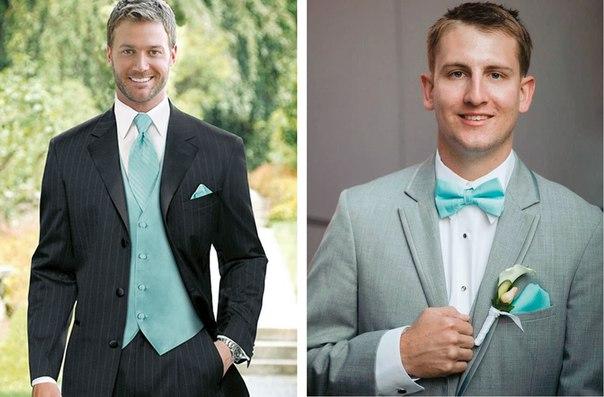Поддержать цвет и стиль Тиффани суждено классическому костюму-тройке. Выбор его цвета – серый или чёрный - особой роли не играет. Главное слово остаётся за аксессуарами. Они должны быть мятно-бирюзового оттенка – жилет или галстук, пиджачный платок или запонки. Но не обувь! Туфли жениха в стиле Тиффани приемлемы только чёрного цвета, простого силуэта, без дизайнерских вывертов.