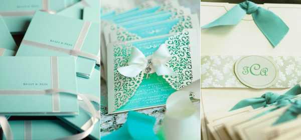 Чтобы подсказка была правильно истолкована, приглашение важно украсить подходящим для свадебной темы образом. Для стиля Тиффани это – стразы, кружева, атласные ленточки-бантики и бело-бирюзовая или кремово-бежевая гамма. Можно сочетать два цвета между собой: молочного цвета бумага и голубые конвертики, например.