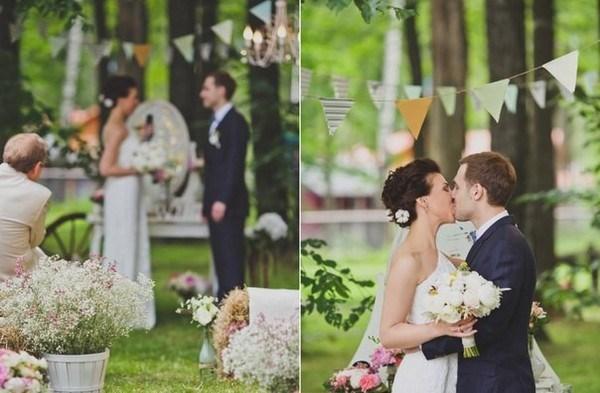 Ограниченная в растратах скромная свадьба тоже имеет право на оригинальность, а добиться этого легче всего с помощью фотозоны, на проработку которой потратится совсем немного средств. Для такого милого и недорогого уголка вполне хватит ниспадающих атласных лент или гирлянды из сердечек разнообразных тонов гармонирующих между собой цветов, нанизанных на веревочке среди пары деревьев, столбов или над дверным проёмом.