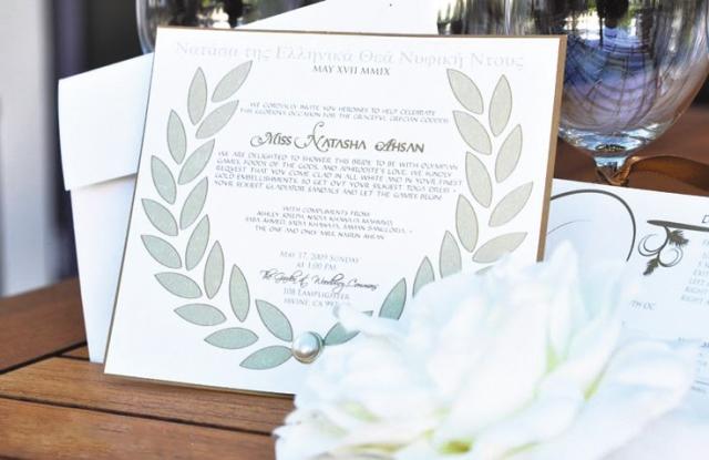 Пригласительные на свадьбу в греческом стиле можно сделать в виде открыток в пастельных тонах с изображением веточек оливы – символа Греции. Более оригинальный вариант – приглашения в виде свитков с печатью.