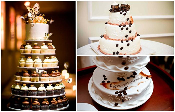 Организовывая кофейную свадьбу, предусмотрите наличие соответствующих угощений. Организуйте кофейный стол или кофейный бар с широким ассортиментом кофе. Предложите гостям хрустящие круассаны. Отличным угощением станет тирамису, приготовленный на кофейной основе; кофейные напитки и коктейли. Дополнит меню кофейной свадьбы, охлажденное мороженое и десерты с его участием. Естественно, вам не обойтись без роскошного свадебного торта, украшенного зернами и забавными фигурками.
