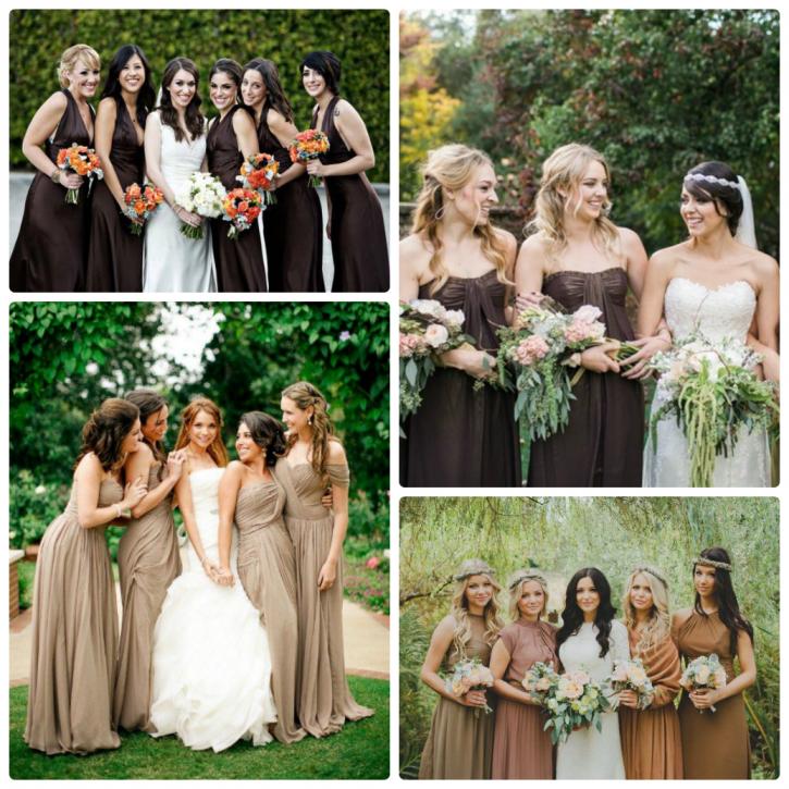 Если вы настаиваете на белом платье, тогда добавьте к нему свадебные аксессуары кофейных оттенков. Цветными элементами к наряду невесты могут быть пояс или туфли. Еще можно обыграть кофейную палитру в нарядах своих подружек.