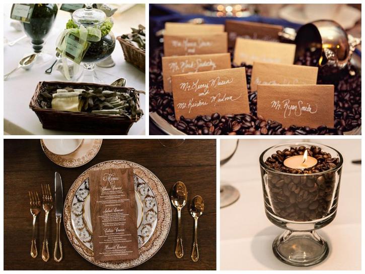 Используйте кофейные зерна при оформлении номеров для столов и плана рассадки гостей, который может принять форму кофейного дерева. Поверх чехлов на спинки гостевых стульев, приклейте специальные наклейки, которые выполнены в форме кофейных зерен, с нанесенными инициалами гостей и монограммой молодоженов.