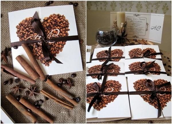 Продумывая стиль пригласительных на свадьбу, проявите фантазию и немного юмора. На ваших пригласительных открытках может красоваться чашечка ароматного кофе, кофейные зерна или ваши совместные фотографии с чашкой кофе в руках.