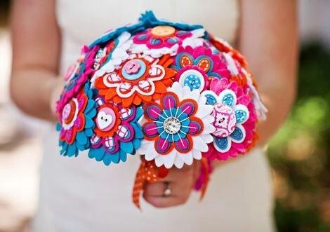 Главный букет дня, а точнее – невесты, также можно сотворить из пуговиц. К слову, не обязательно из белых. Весьма оригинальным будет смотреться смешение белоснежного или пастельного платья невесты и разноцветного букета! Можно еще постараться, и «откликнуться» свадебными туфельками в тон букету. На полках магазинов вы вряд ли найдете такое произведение искусства. Поэтому придется украшать обувь самостоятельно.
