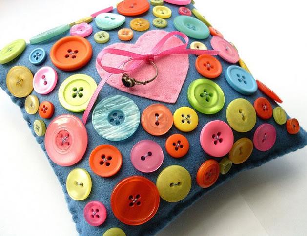 Пригласительные будут отлично себя чувствовать в компании родственницы. Речь идет о подушечке для обручальных колец. Кружево, атлас, шелк, стразы? Да, вы, граждане, видать, в прошлом веке живете. Позитив, креатив и безудержное веселье – вот главные характеристики свадьбы и всех ее деталей. В том числе и подушечки для колец. А все вышеперечисленные зажигательные эмоции поможет вызвать россыпь ярких пуговиц, разнообразных форм, размеров, а главное – расцветок.