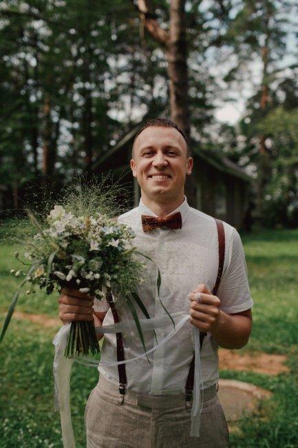 Мужчины, не привыкшие к строгим костюмам, могут вздохнуть с облегчением. Образ деревенского жениха – это джинсы или свободные брюки с рубашкой простого кроя и свободно повязанным галстуком. Трендовые дизайнеры рекомендуют завершить образ модной жилеткой из льна, шерсти, трикотажа и мокасинами натуральных оттенков. Сделать внешний вид особенным и индивидуальным помогут подтяжки или головной убор (кепка из тканевых материалов либо соломенная шляпа).