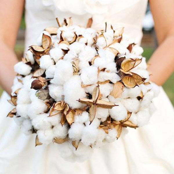 Одной из необычных и актуальных решений для свадебного букета – композиция из хлопка. Такой сухоцвет отлично сочетается с ранункулюсами, лавандой, пионовидными розами, лагурусом, гортензией. Особенно полюбились хлопковые букеты зимним невестам. Флористы умело сочетают хлопок с шишками, еловыми ветками, яблочками и ягодами. Также отличным декором послужат кристаллы, атласные ленты, кружево и жемчуг. Будьте уверены, ваш букет станет героем многих свадебных фотографий.