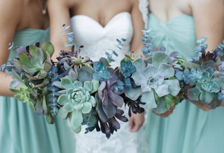 Один из страшных кошмаров невесты – завядший к концу свадьбы (а может быть и к её началу) свадебный букет. Не стоит переживать, ведь спутником вашего дня может стать букет из суккулентов. Композиция из таких растений не только необычна и красива, но и довольно практична. Суккуленты имеют сверхспособность сохранять влагу и гарантированно останутся в лучшем виде до конца дня. Наиболее востребованы в свадебной флористике такие суккуленты, как хавортия, алоэ, каменная роза и всем знакомое «денежное дерево». Последнее наверняка придётся по вкусу любителям