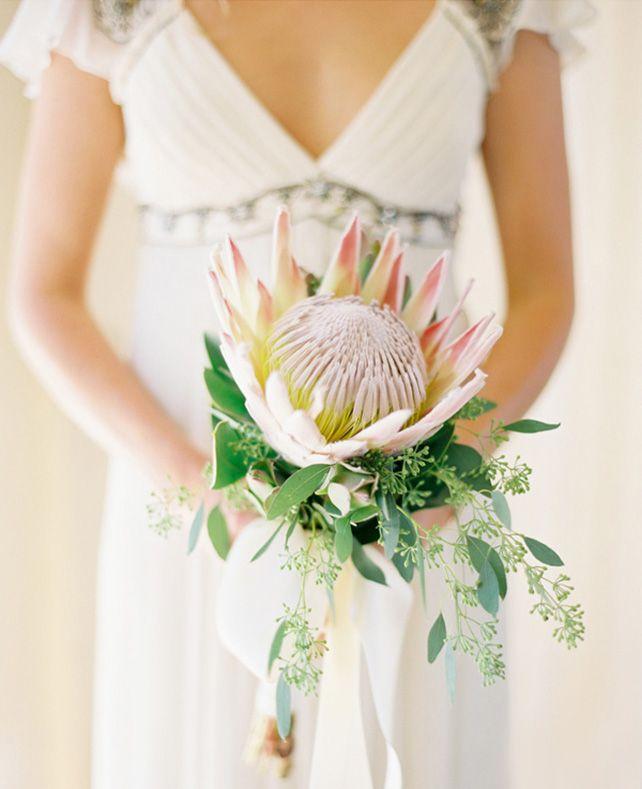 Для тех, кто далёк от флористики, озвученный мастером «рецепт» букета может показаться заклинанием. Так может быть, не стоит всё усложнять и выбрать всего один цветок? Кстати, сэкономив при этом и семейный бюджет, и воплотив тренд 2020 сезона. Если вы решили сделать свадебный букет в виде огромного цветка, выбирайте протеи, большие пионы и подсолнухи крупных размеров. Такие гигантские цветки дополняют и украшают зеленью, лентами и другими украшениями.