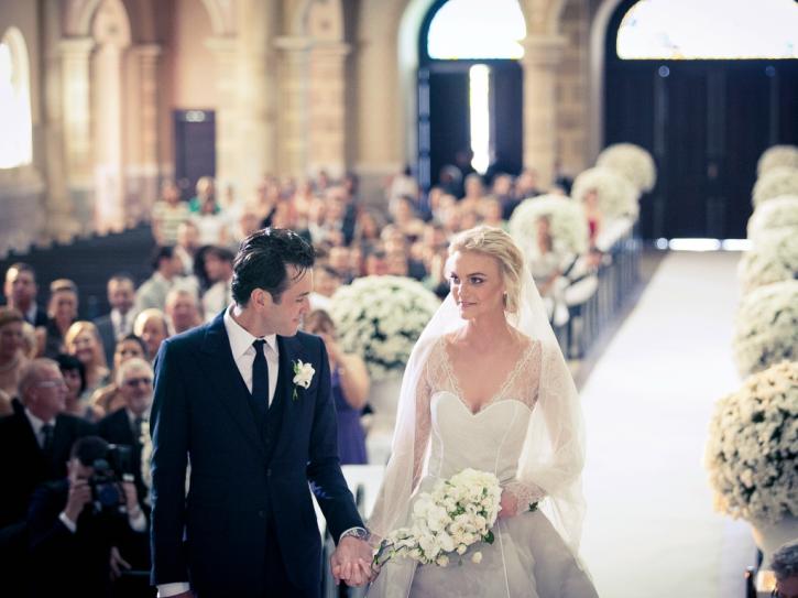 Молодожены идут по белой дорожке, ведущей к красиво украшенной арке на берегу живописного водоема среди горных вершин. Гости осыпают лепестками роз и весело приветствуют.