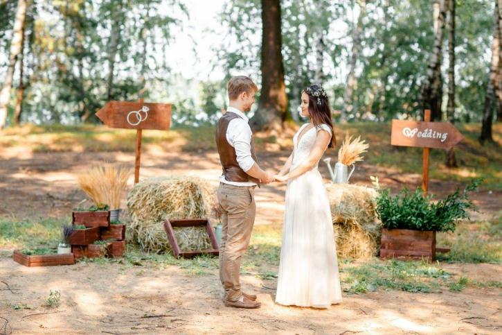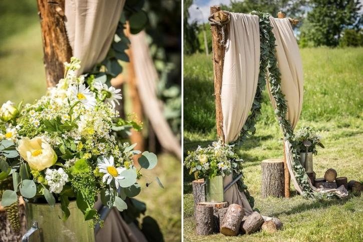 Для таких свадеб идеально подходят аккуратные деревянные арки в стиле минимализм, которые дополняются ветками с мелкими белыми цветочками или просто оплетаются зеленой лозой.