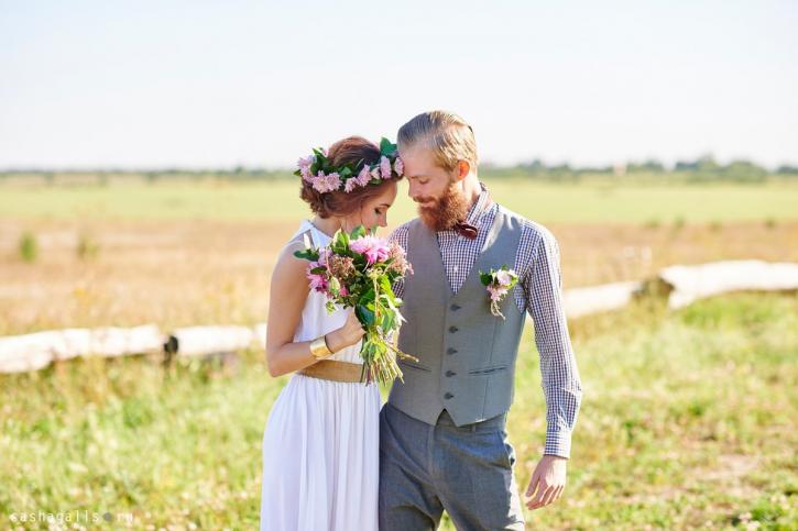 Поэтому лучше рассмотреть в качестве свадебного платья сарафан, на голову надеть венок из полевых цветков, да и от обуви на каблуках лучше отказаться.