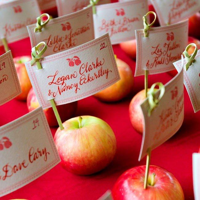 Яблочные мотивы должны быть везде. Неплохо, если вам удастся отыскать тарелки и бокалы с таким риснуком, не поленитесь заказать салфетки с изображением плодов. Все это мелочи, но они подчеркнут общую стилистику свадьбы и создадут необходимое настроение. А вместо посадочных карт используйте яблочки с флажками.