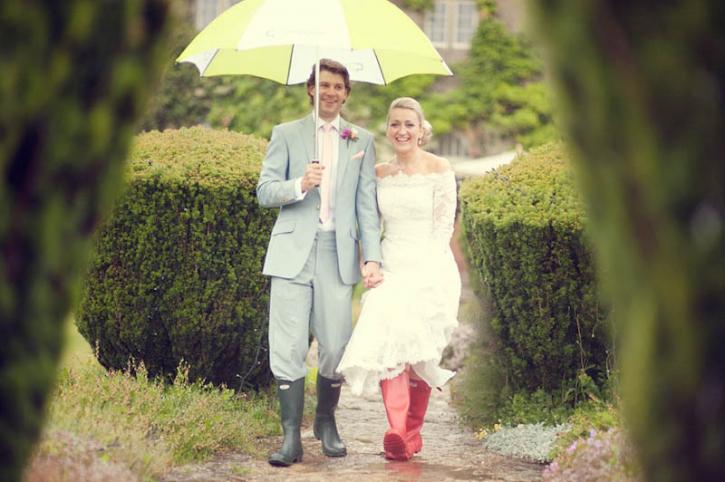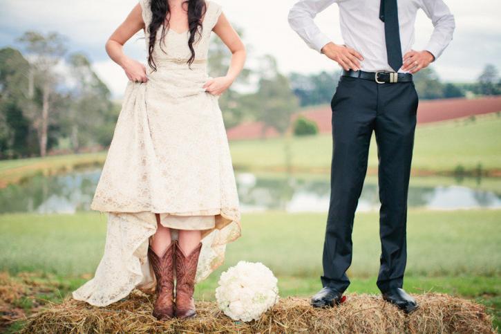 На ковбойской свадьбе уместно выглядят джинсовые наряды и высокие сапоги, которые отлично подходят для промозглой погоды. Цветовая гамма – оранжевая, розовая или голубая, а в качестве аксессуара не помешают зонты.