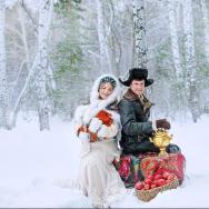 Зимой свадьба в русском стиле выглядит особенно ярко. Самовары, расписные блюда, хлебосольный стол с традиционными угощениями. Невеста с узорчатым шерстяным платком на плечах. А в качестве экипажа для молодоженов для передвижения за городом отлично подойдут сани, запряженные парой резвых лошадок.