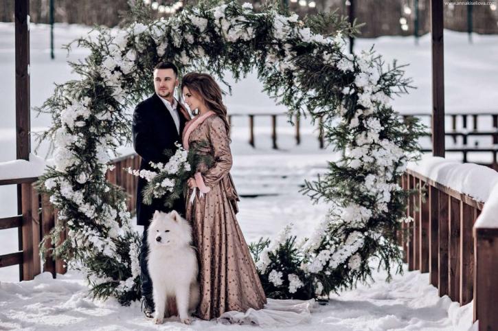 Совет: на ваше усмотрение, можно добавить в такое торжество немного сказочных ноток. Во многих из русских сказок действие происходит зимой: всеми любимые «Морозко», «Двенадцать месяцев», «Снегурочка». Так, невеста, голову которой венчает красивый стилизованный кокошник, будет смотреться восхитительно, а венчальная арка из еловых ветвей и шишек довершит волшебную атмосферу.
