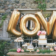 Если привычные круглые шары вам поднадоели и кажутся банальными или предназначенными для детских утренников, возьмите на вооружение фольгированные шары-буквы они тоже бывают разных размеров, даже те, что по длине около метра. Из них придумывайте любые надписи - имена молодожёнов, свадебное число, месяц и год, слова «любовь», «семья» и прочее.