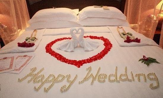 Когда жених доволен работой подружек невесты, когда кровать окончательно застелена, гости усыпают ее рисом, монетами, лепестками роз и миндальным драже, тем самым желая будущим супругам богатства и счастья. Затем из присутствующих детей выберут самого маленького и положат на кровать, чтобы обеспечить паре плодовитость. Если это мальчик, то мальчиком будет и первенец молодой семьи, если девочка - то и у пары родится девочка.