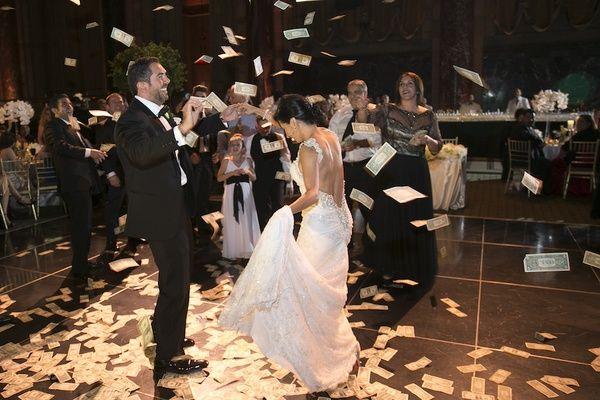 Во время первого танца молодоженов гости прикалывают или вешают на их одежду купюры или целые гирлянды из денег, желая таким образом богатства и процветания молодой семье.