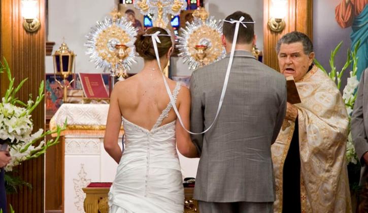 После выхода невесты вся процессия отправляется на венчание. На пути в храм жених и невеста не должны быть вместе. Первым к церкви приезжает жених и ожидает будущую жену, стоя у дверей.