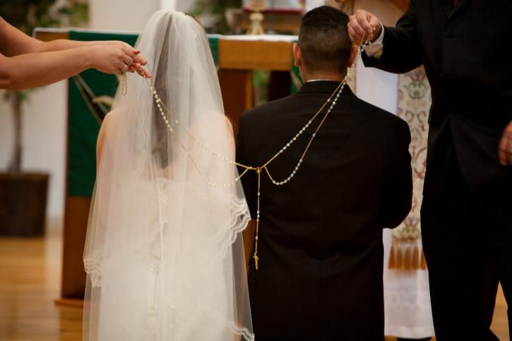 В церкви молодым, после того как они пообещают друг другу супружескую верность и произнесут основные свадебные клятвы, накидывается на плечи «лассо» - белая лента (иногда четки), как символ союза новобрачных.