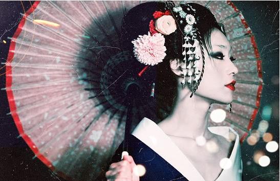 - веер и зонтик, веточка сакуры в волосах – в качестве аксессуаров;