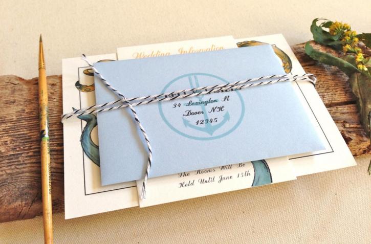 Для оформления свадьбы в морском стиле понадобятся: ракушки, галька, жемчужины, шнуры и канаты, морские узлы и их изображения, штурвалы, спасательные круги и якоря в разных исполнениях, полосатый текстиль, морские звезды и кусочки кораллов, речной/морской песок, рыболовные сети, маяки, много синего и белого цвета.