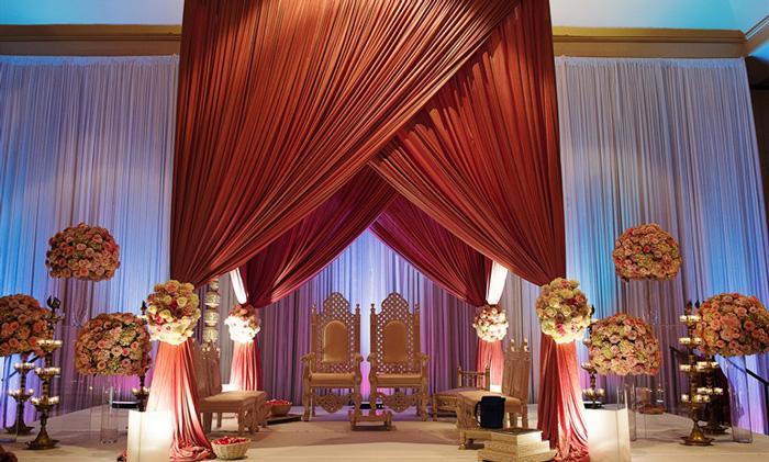 Индийская свадьба не обходится без специального помоста для молодоженов. Традиционно его украшают живыми цветами, но современные тенденции склоняются к драпировке его тканями – шелком, тюлем.