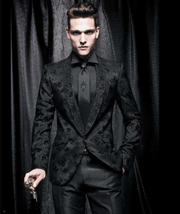 Приближение осени с ее холодной и меланхоличной погодой воздействует на дизайнеров психоделически и всегда по-разному. Многие из них вывели на осенний подиум стиль, небрежно окинутый депрессивным, осенним полумраком. Это печальные, угрюмые, пасмурные, но очень элегантные образы. Если вздумалось передать на свадьбе атмосферу таинственности и некоей мистики, местами даже сумрачного антуража, то, безусловно, стоило бы обратить свое внимание на высококлассные костюмы Yang Li. В таком облачении так и тянет отправиться в средневековую крепость, обитель регалий, знатных пиров и мистической завораживающей атмосферы. Для действительно смелых духом дизайнер подготовил брюки с принтом, создающим имитацию скелета. Влиянию угрюмой и притягательной темными образами готичности поддался и дом Dior Homme. Эстетическую притягательность темным оттенкам и четким линиям костюма добавляют перчатки, которым свойственно добавлять обладателю некой таинственности, окутывать тайнами в сочетании общим мглистым антуражем.
