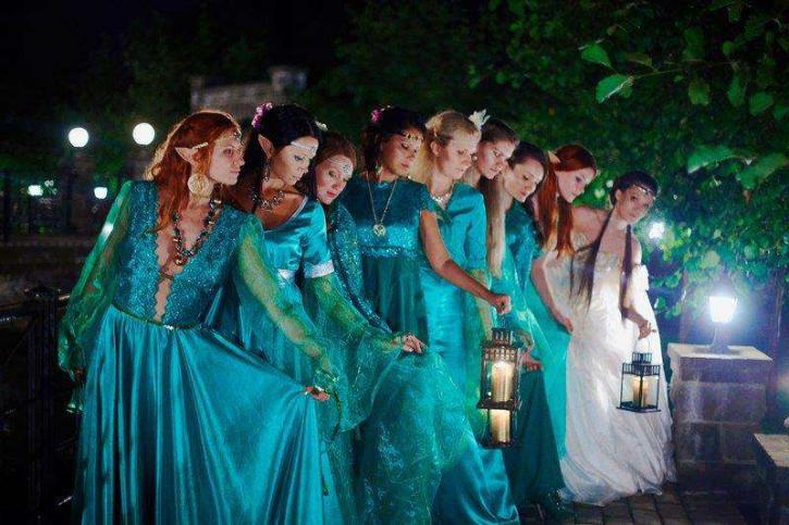Невесте в таком сценарии предписана роль лесной царицы. Здесь же, играя воображением, выплескивая все краски фантазии наружу, можно придумать прекрасный колоритный наряд. Драгоценности, воздушная фата, инкрустированные разнообразными камнями... Так же не стоит забывать про парчу - вот и готовый образ. Одеяния жениха так же стоит предусмотреть, основываясь на сказочной тематике. Главное - гармония цвета.