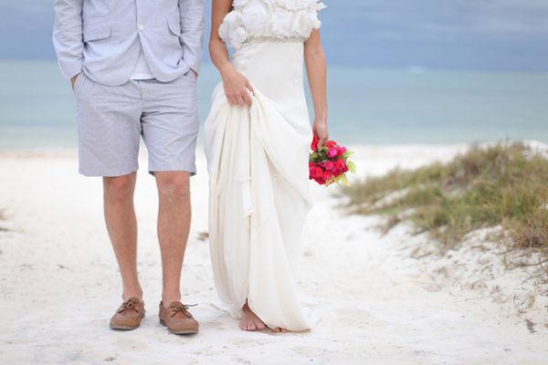 Безусловно, свадебное платье невероятно красиво, притягательно и так нравится девушкам: длинные шлейфы, фата и прочие атрибуты… Но лучше от них избавиться в жаркий день. Держите наготове подходящее легкое платье с такими же легкими туфлями. Кстати, туфли лучше разносить заранее и каблук выбирать не самый большой, ведь вам придется достаточно много ходить. Если все же вы не в праве отказать себе в свадебном платье, достаточно учесть вышеописанный вариант. Самым подходящим временем для переодевания как раз будет перед началом банкета. Что касается непосредственно жениха - желательно не облачаться в тяжелый черный костюм. Из школьного курса физики всем нам известно, что черный цвет поглощает тепло куда сильнее, чем светлые тона. Поэтому одежду стоит подбирать из расчета на белые летние тона, желательно из легкого материала.